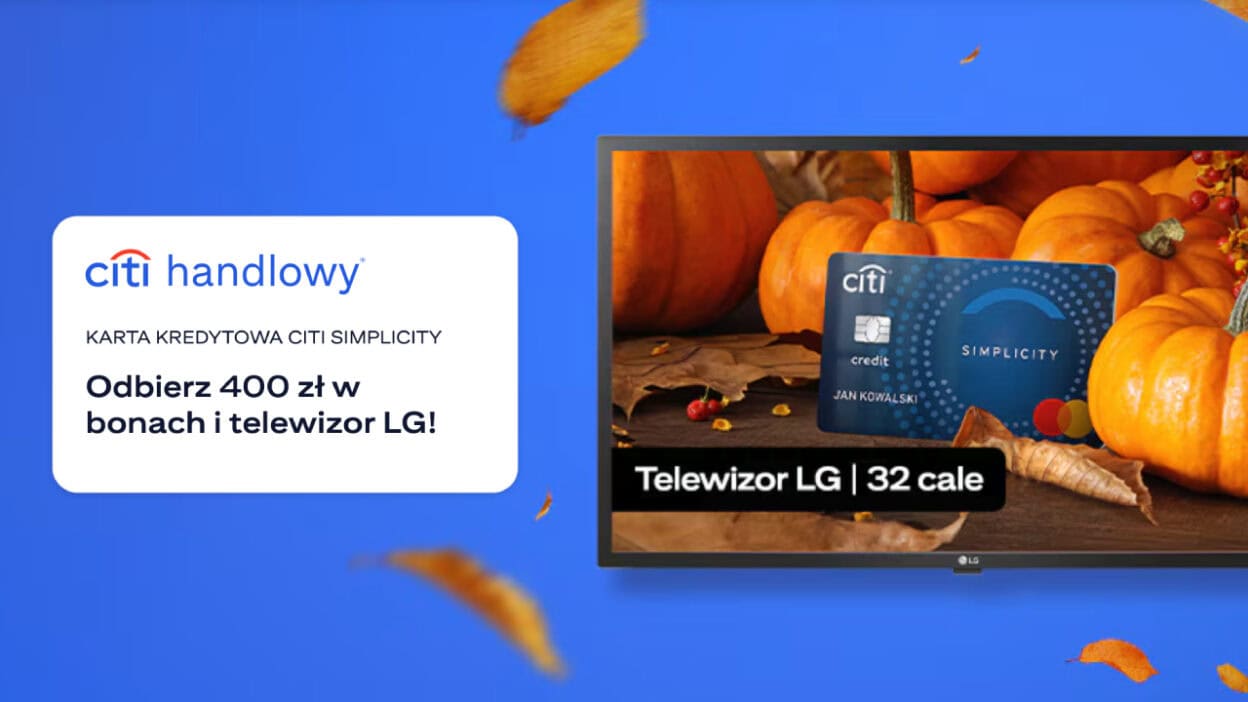 Bank Citi Handlowy ruszył z kolejną ciekawą promocją, która mocno wyróżnia się na tle konkurencji. Dzięki niej możesz zgarnąć telewizor LG 32” Full HD o wartości 866 zł, a dodatkowo nawet 400 zł w punktach Bezcenne Chwile, które wymienisz m.in. na bony do Allegro czy bilety do kina.